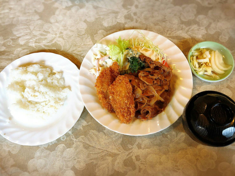 生姜焼き+魚フライ