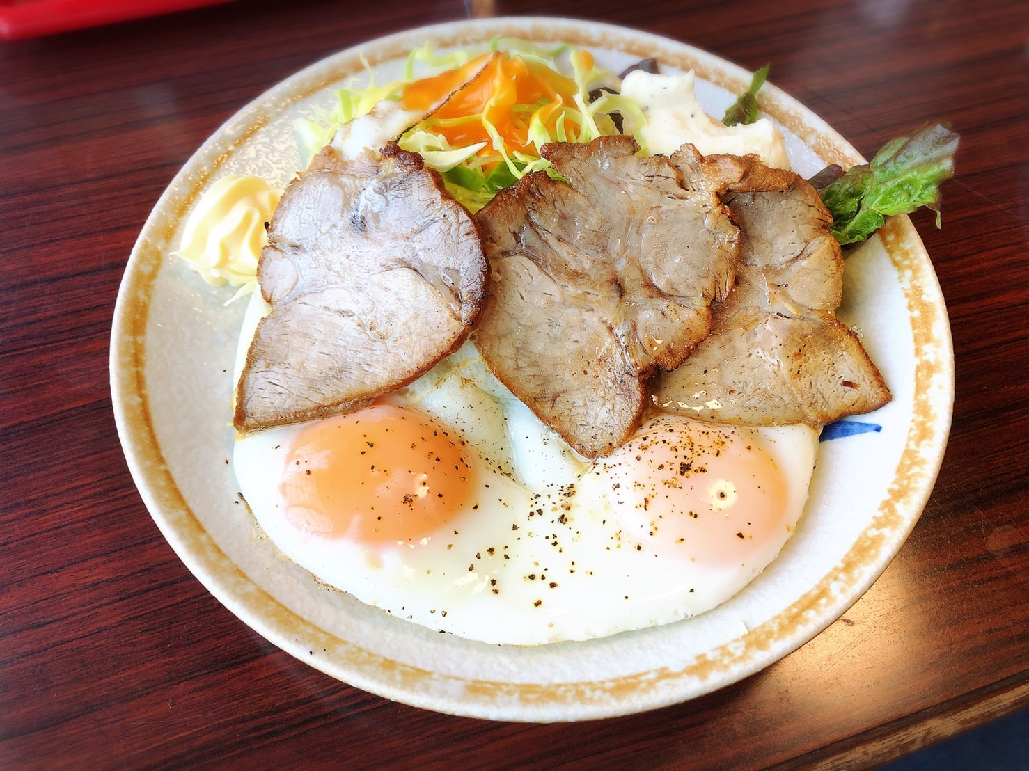 焼肉の味付けが美味しくて、ご飯が進みます。チャーシューエッグは、もう見た目から分かるように間違いない美味しさ!ご飯にのっけて食べるのが幸せ